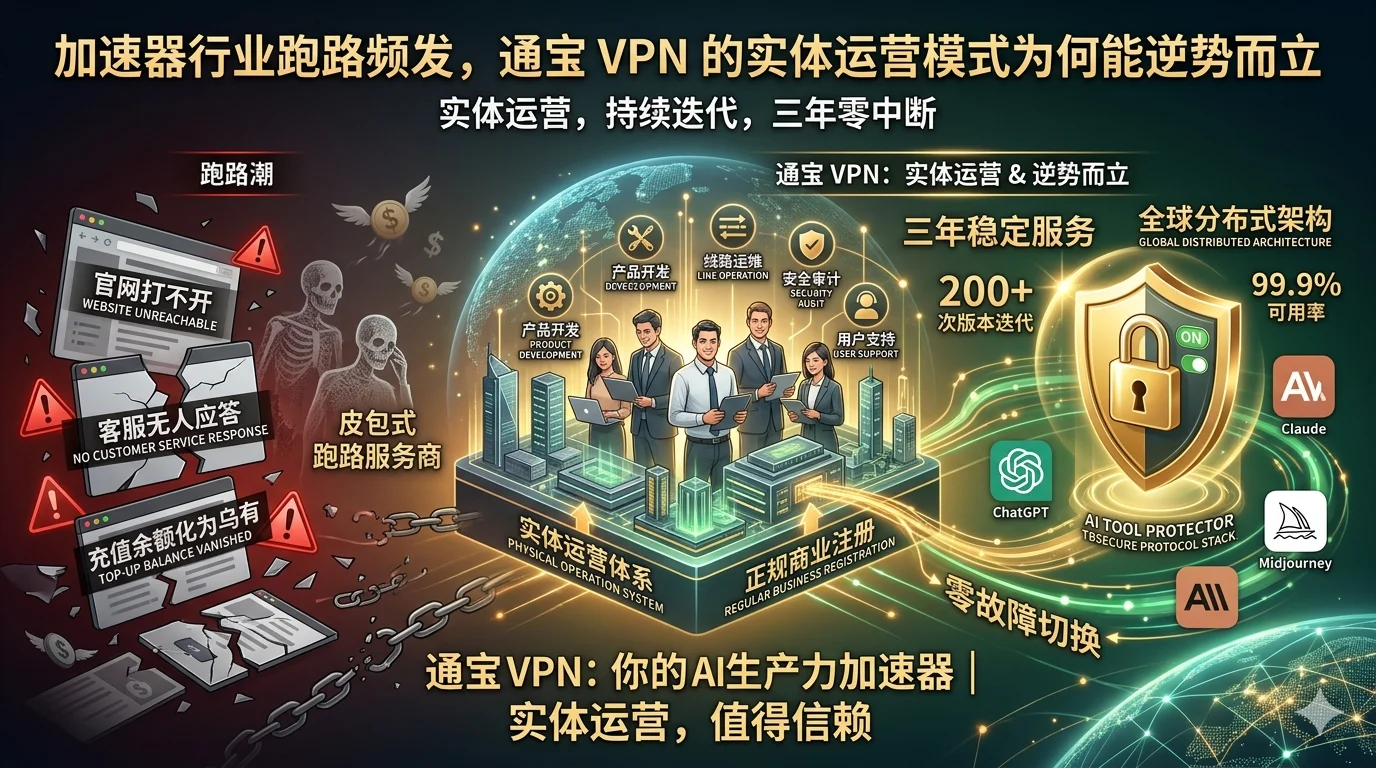 过去几年,网络加速器行业经历了一轮又一轮的"跑路潮"。无数用户在预付了半年甚至一年的费用后,发现服务商一夜之间人间蒸发——官网打不开、客服无人应答、充值余额化为乌有。在这样的行业背景下,通宝 VPN 以实体运营、持续迭代的姿态稳定服务了三年,成为用户心中的一股清流。这份底气,究竟从何而来?