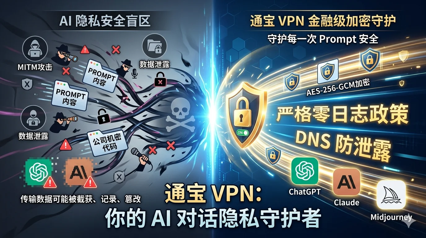 你是否意识到,每天发给 ChatGPT 和 Claude 的 Prompt 中可能包含公司机密代码、未发布的商业计划、客户敏感数据甚至个人隐私信息?在普通网络环境下,这些 AI 对话数据在传输过程中可能被中间节点截获、记录甚至篡改。AI 隐私安全已经成为企业和个人用户必须正视的问题,而通宝 VPN 的金融级加密技术正是为守护你的每一次 Prompt 安全而打造。